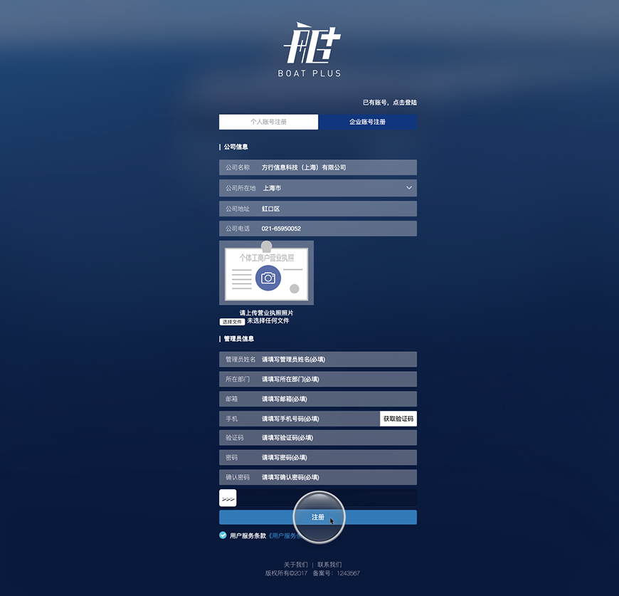 輸入公司名稱、公司所在地、公司地址、公司電話、營(yíng)業(yè)執(zhí)照和所在部門。