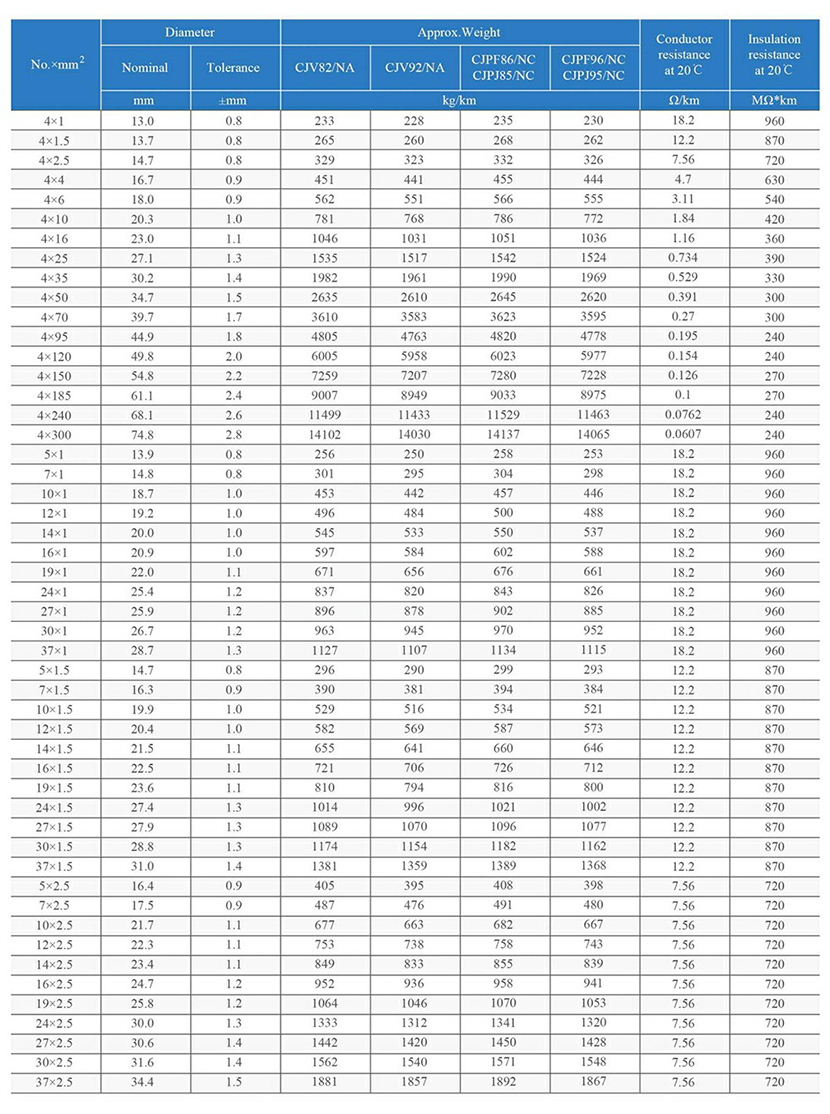 20℃時的導體電阻: 0.154Ω/km 20℃時的絕緣電阻: 240MΩ×km