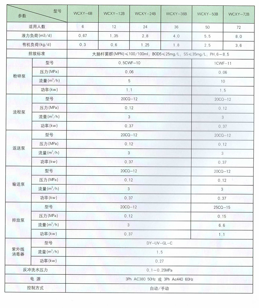 排放指標: 大腸桿菌群(MPN)≤100/100ml;BOD5≤25mg/L;SS≤35mg/L;PH 6~8.5 液力負荷: 2.8m3/d
