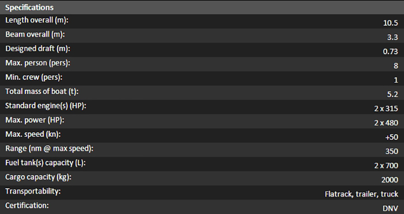 | 總長(zhǎng): | 10.5m | 航速: | 50kn |