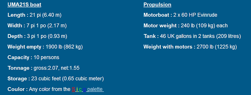 凈重: 862kg 推進裝置: 2×60HP Evinrude