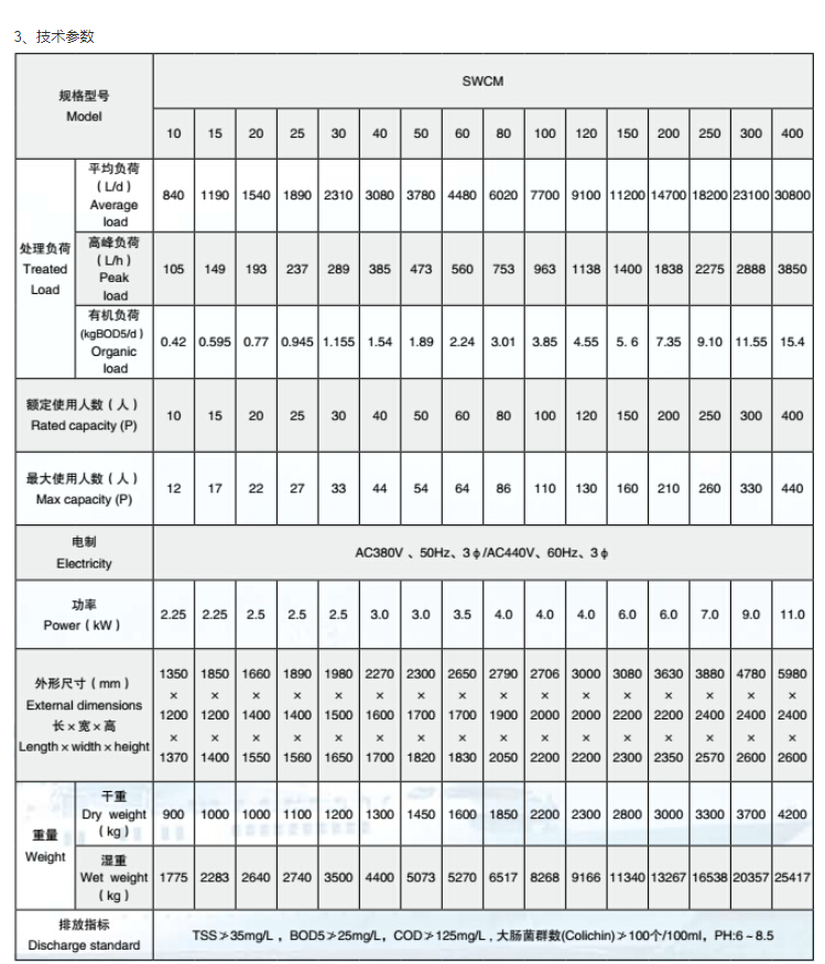 | 重量(濕重): | 4400kg | 排放指標(biāo): | TSS≯35mg/L,BOD5≯25mg/L,COD≯125mg/L,大腸菌群數(shù)(Colichin)≯100個/100ml,PH-6~8.5 |