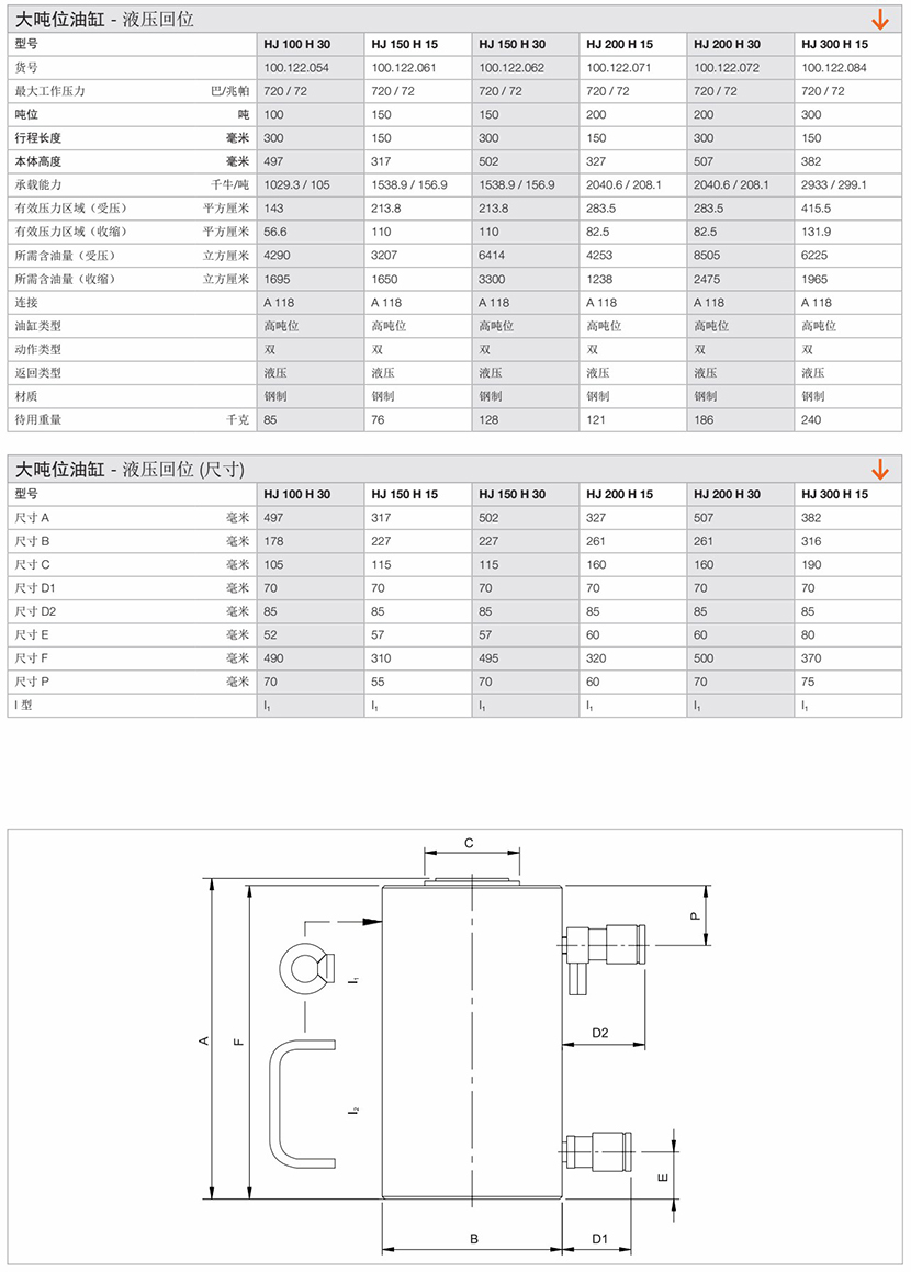 最大工作壓力: 720巴/72兆帕 第一段行程長度: 150 毫米