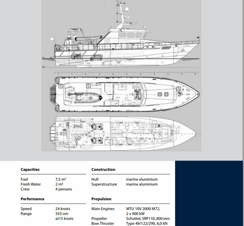 發動機功率: 2 x 900 kW 推進裝置: Schottel, SRP110, 800 mm