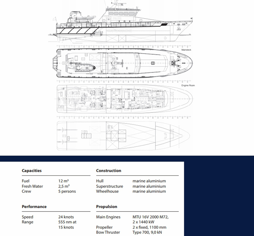 | 發(fā)動(dòng)機(jī)功率: | 2 x 1440kW | 推進(jìn)裝置: | 2 x fi xed, 1100 mm |