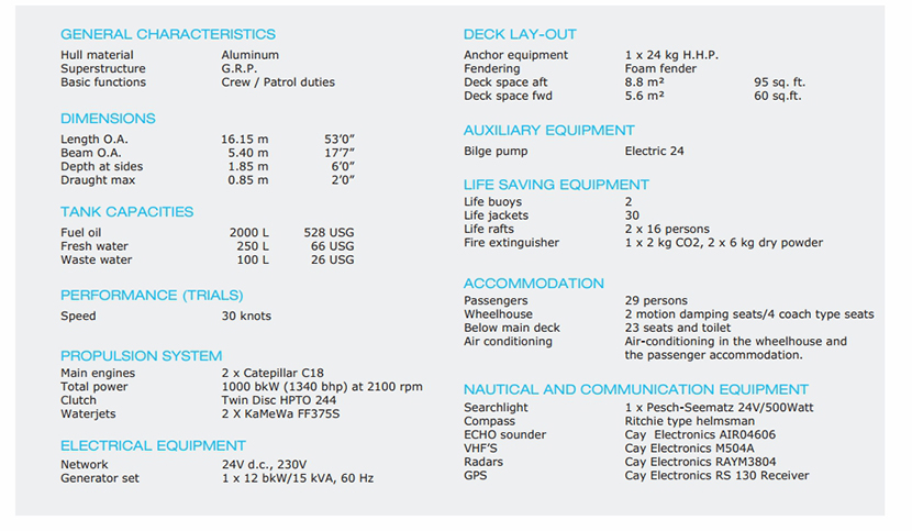 噴水器: 2x kamewa FF375s 發電機組: 1x12bkw/15kva,60Hz