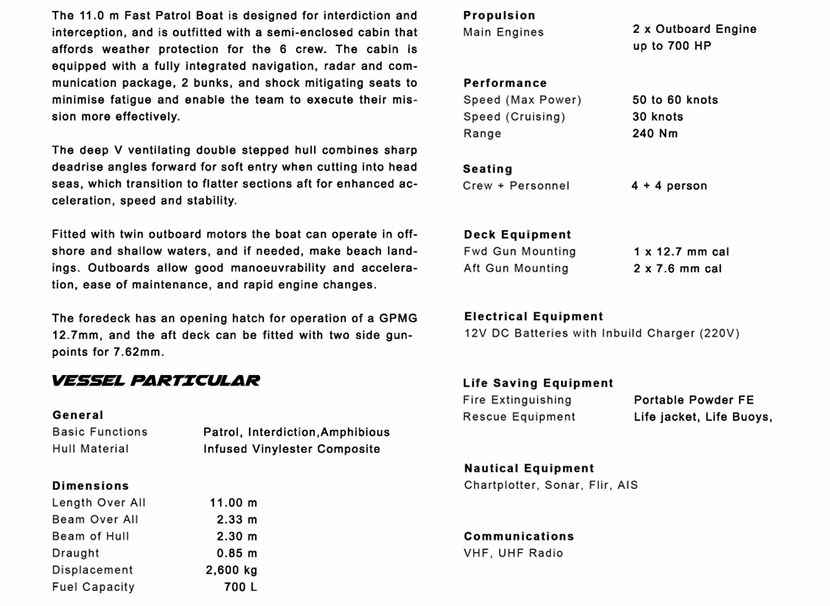 | 燃油容量: | 700l | 發動機功率: | 2xoutboard engine 700HP |
