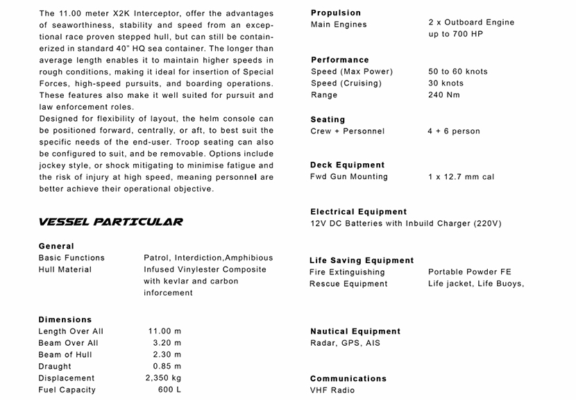 燃油容量: 600l 發動機功率: 2xoutboard engine 700HP