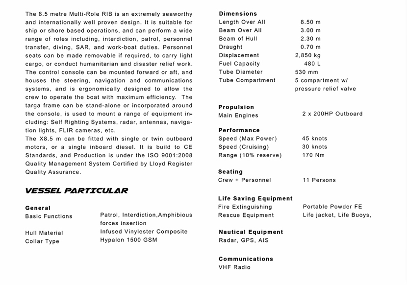 | 8.5米剛性船體充氣巡邏艇 | |||