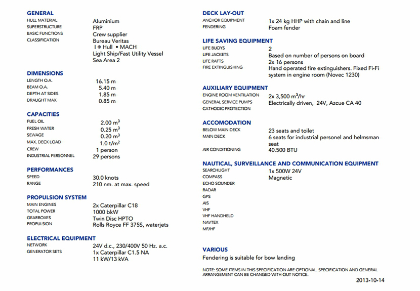 發電機組: 2×Caterpilar C18 船組人員: 1P