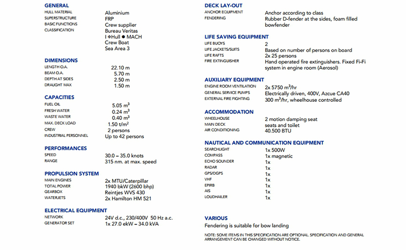 發電機組: 2×Caterpilar /MTU 船組人員: 2 P