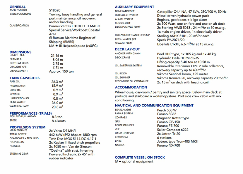 | 發動機功率: | 442bkW at 1800rpm | 推進裝置: | 2×Kaplan II fixed pitch, propellers |