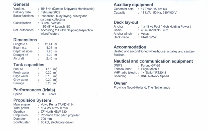 | 發(fā)動(dòng)機(jī)功率: | 104bkW at 2500rpm | 推進(jìn)裝置: | Promarin fixed pitch propellers |