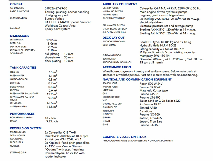 | 發(fā)動機功率: | 894bkW at 1800rpm | 推進裝置: | 2×Kaplan II fixed pitch, propellers |
