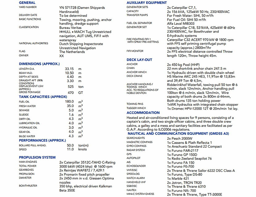 | 發(fā)電機組: | 2×Caterpilar 3512C-TAHD C-Rating | 齒輪箱: | 2×Reintjes WAF 872 |