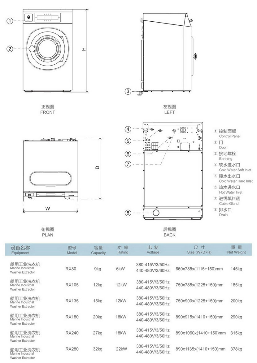 | 類型: | 船用洗衣機 | 尺寸: | 690×770×(980+150)mm |