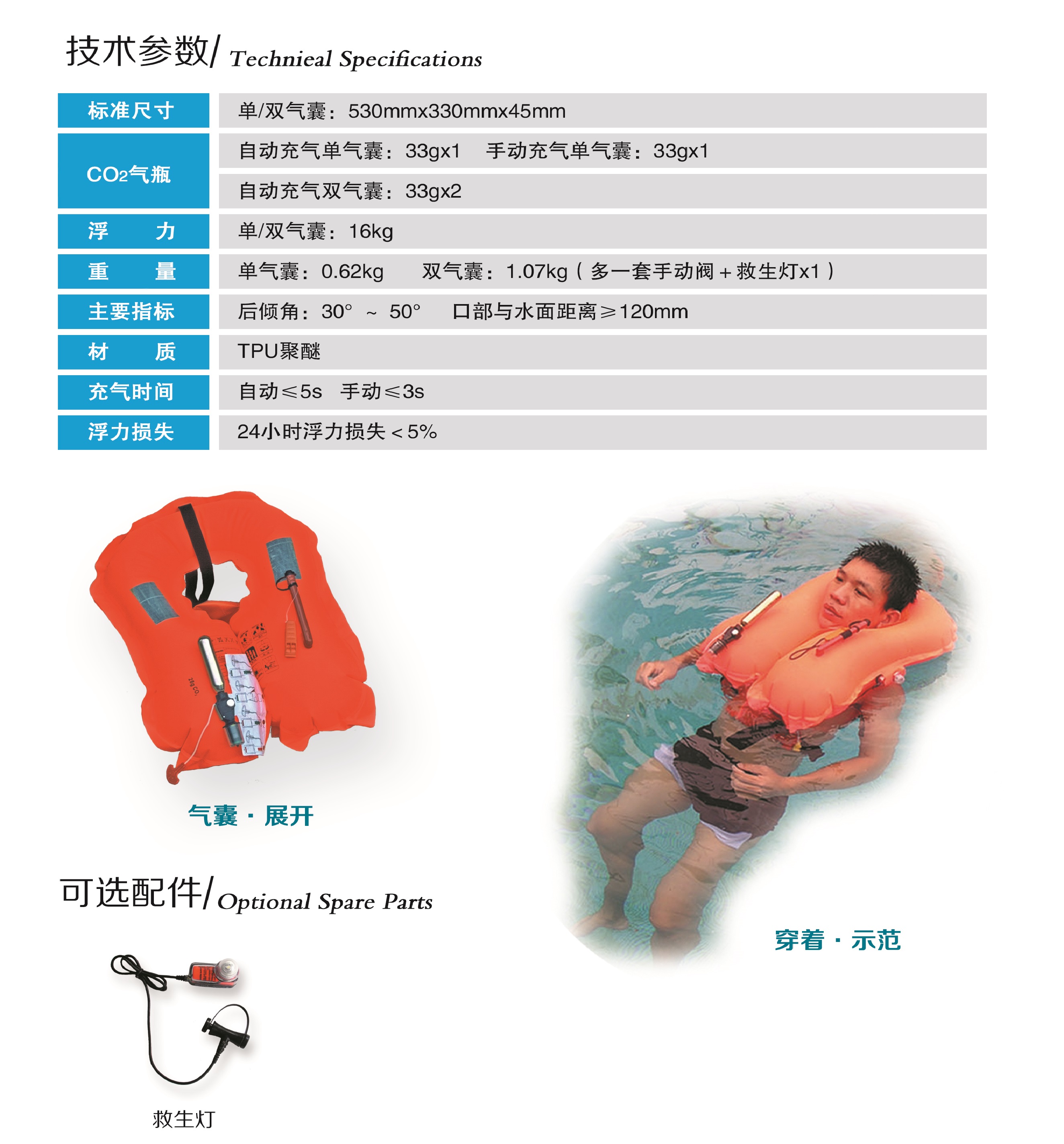 | 充氣時間: | 自動≤5s 手動≤3s | 浮力損失: | 24小時浮力損失<5% |