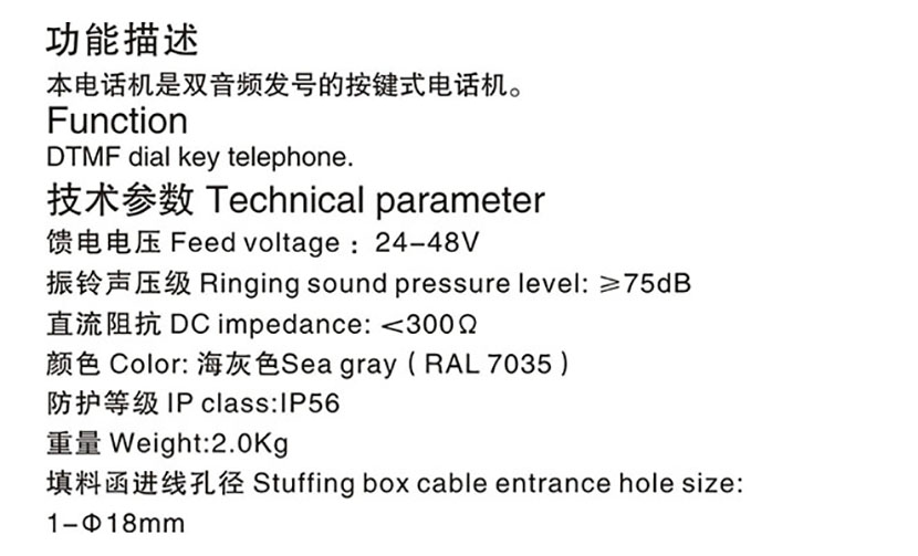 饋電電壓: 24-48V 振鈴聲壓級: ≥75dB