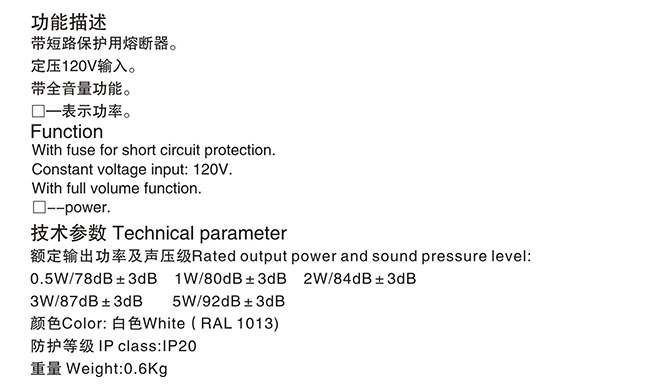 | 功率: | 2W | 聲壓等級(jí): | 84dB |