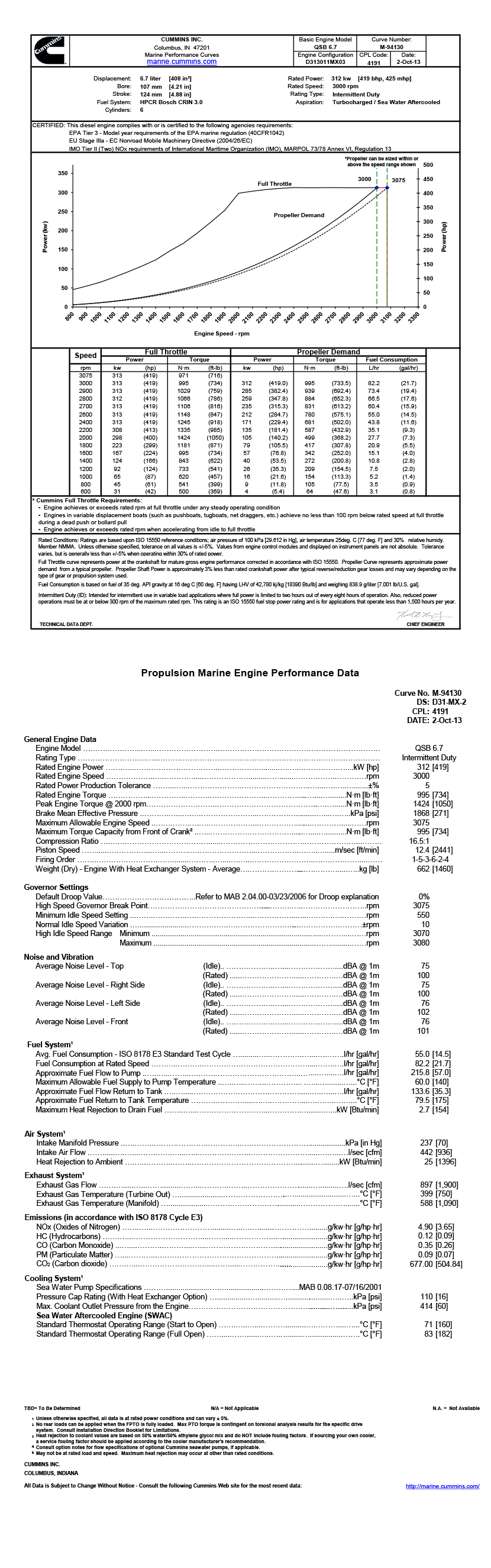 進氣方式: Turbocharged/Sea Water Aftercooled 最大扭矩: 1424N.M(轉速為2000rpm下的最大扭矩)