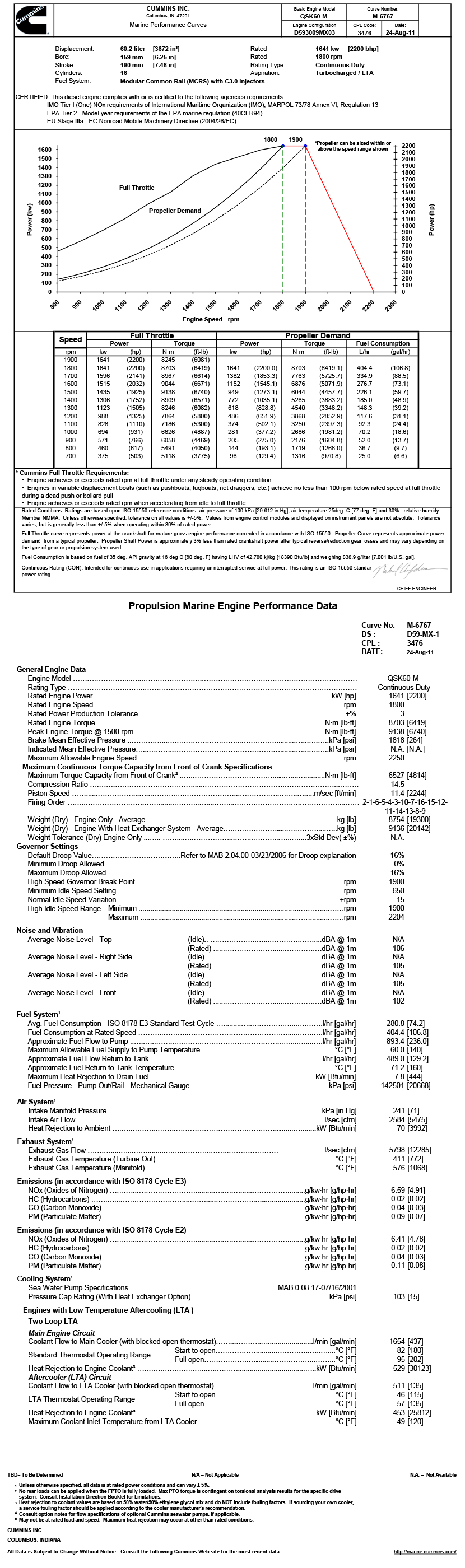 排放標準: IMO Tier I (One) NOx requirements of International Maritime Organization (IMO), MARPOL 73/78 Annex VI, Regulation 13 EPA Tier 2 - Model year requirements of the EPA marine regulation (40CFR94) EU Stage IIIa - EC Nonroad Mobile Machinery Directive (2004/26/EC)
