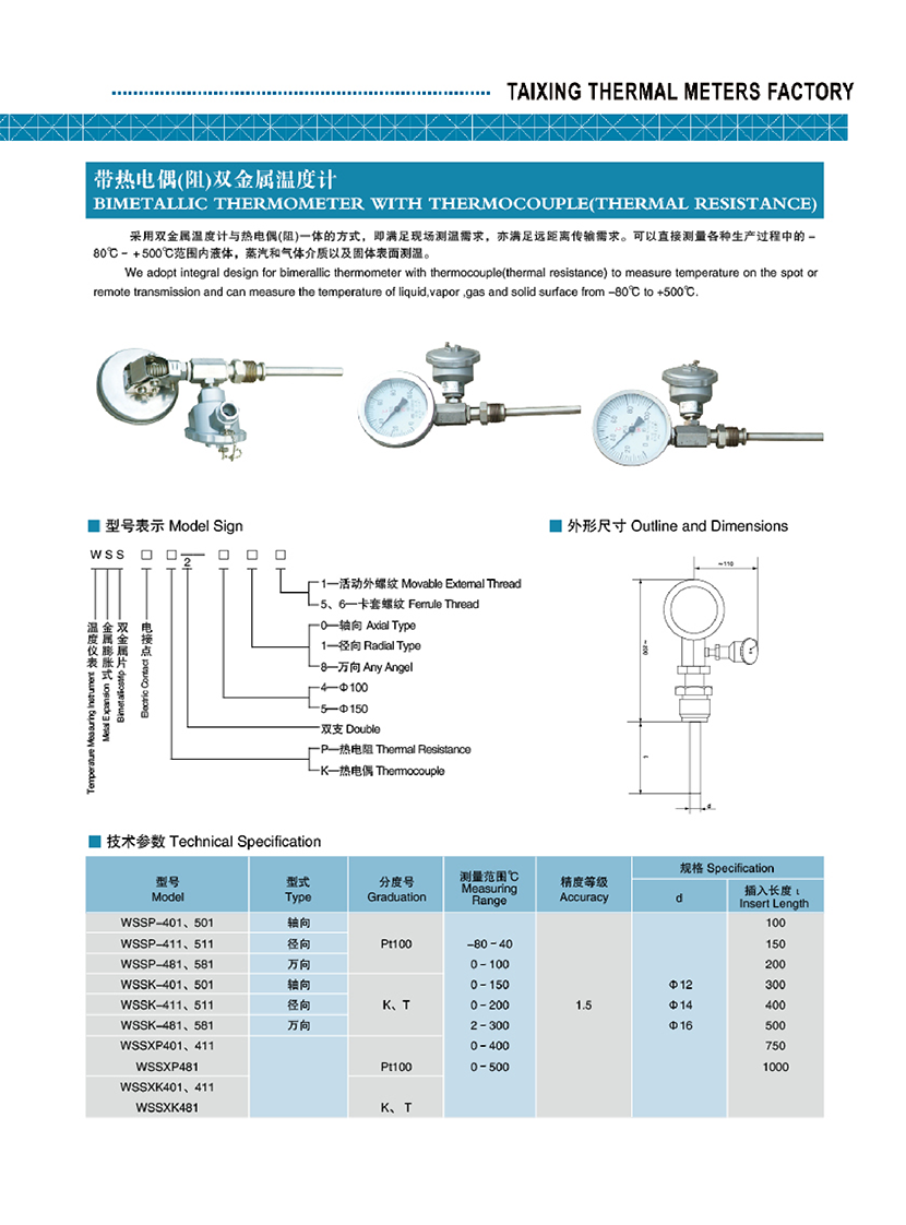 | 帶熱電偶(阻)雙金屬溫度計(jì) | |||