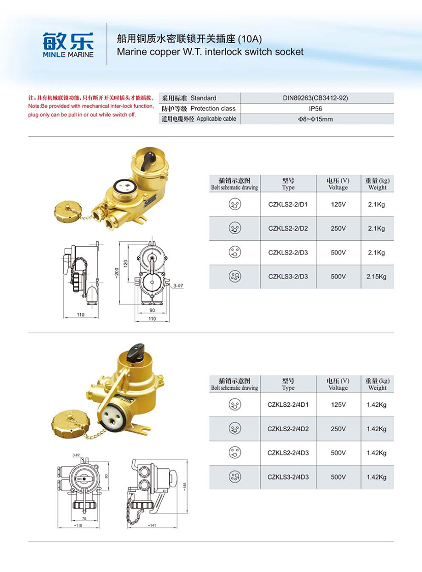 艦船用10A銅質帶開關插座和帶開關聯鎖插座