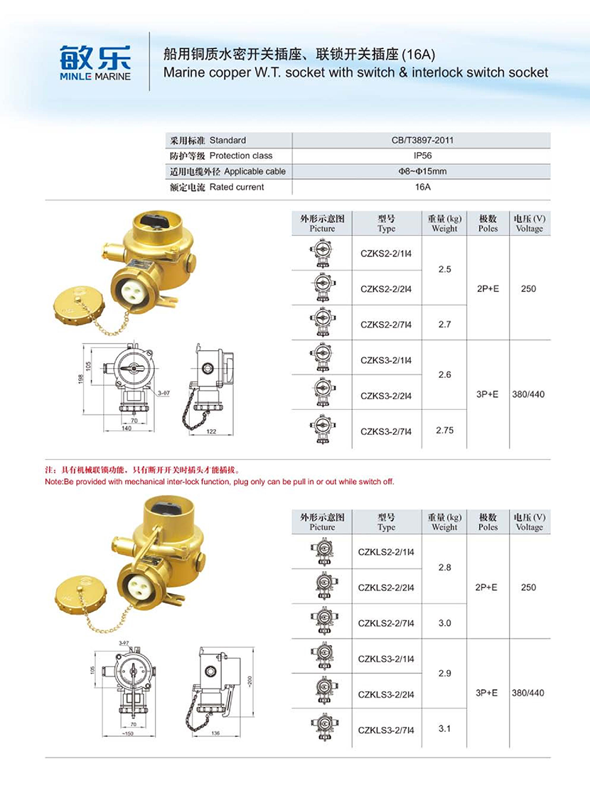 艦船用16A銅質帶開關插座和帶開關聯鎖插座