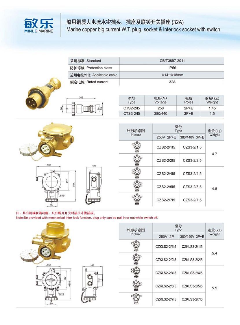| 船用銅質(zhì)大電流水密聯(lián)鎖開關(guān)插座(32A) | |||