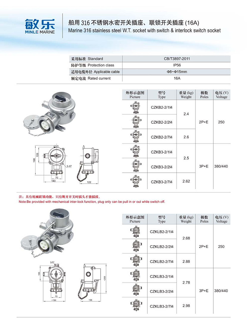 | 船用316不銹鋼水密聯(lián)鎖開關插座(16A) | |||