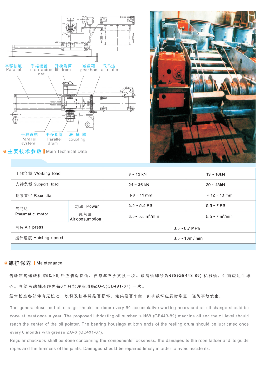 鋼索直徑: φ9~11mm 工作壓力: 8~12KN
