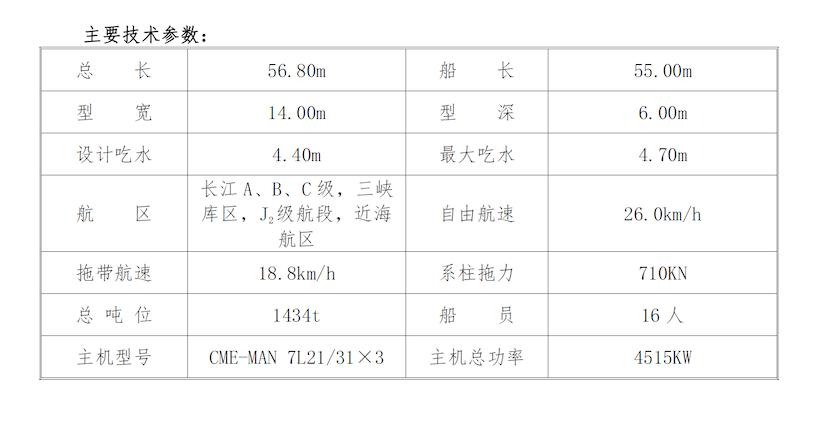 拖力: 710kN 航區: 長江A、B、C級,三峽庫區,J?級航段,近海航區