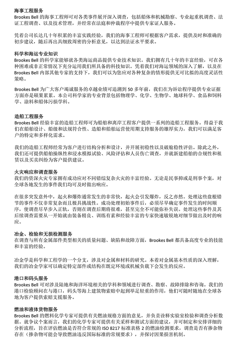 專業優勢: 海運商品所涉專業科學家分布門類眾多;精通造船技術、船舶設計及各類海事規范;具備法證級別的調查、檢測及技術支持能力;事故調查需求響應速度領先;專家團隊資歷深厚、實踐經驗豐富
