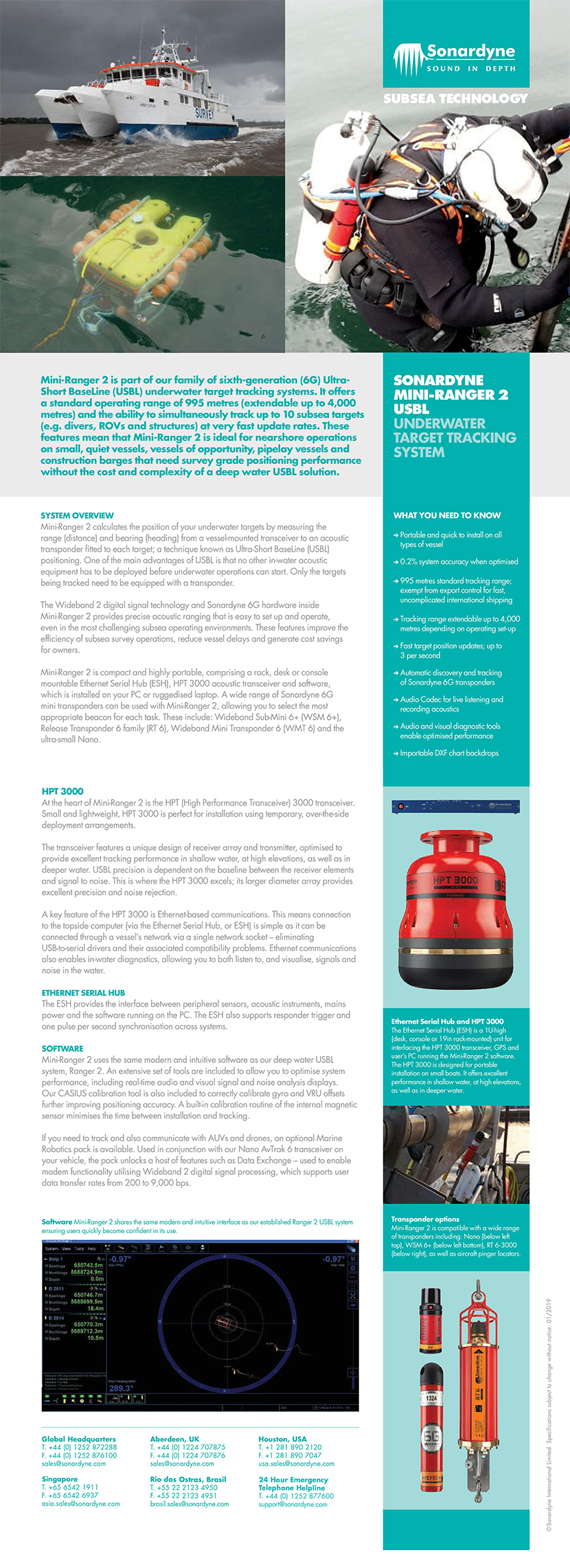 性能亮點: Portable and quickly to install and mobilize;Reliable performance both in shallow and deep environment; Automatic discovery and tracking; Accuracy without the affect of depth; Without the cost and complexity of a deep water USBL solution; Reduce vessel delays; Cost saving for owners 售后政策: 1 year return to Sonardyne service centre; expert advice; operator trainning; email helpline and 24 hour worldwide telephone help-line+AA12;annual service visit