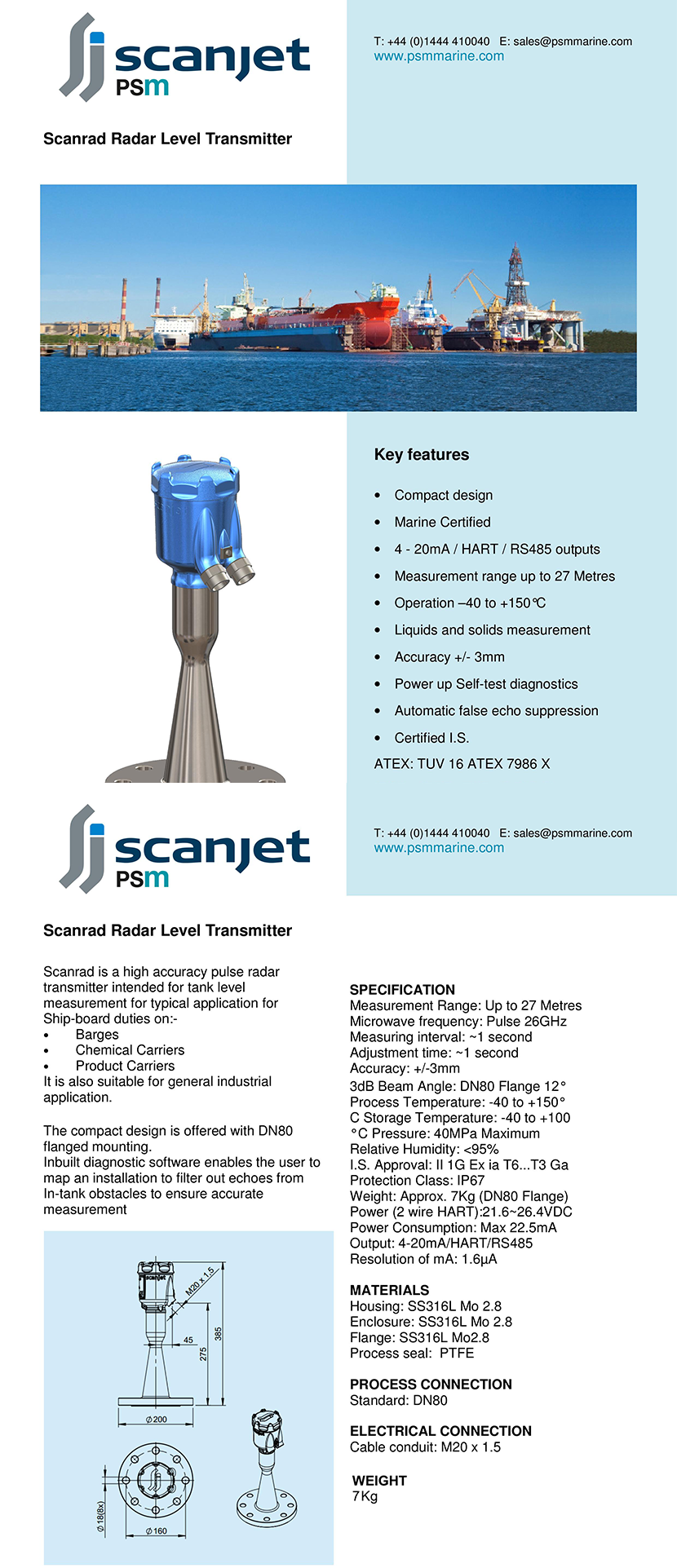 性能亮點: Radar self-test during power up; Automatic false echo suppression; Compact design; Fully integrated with the Scanjet Surveyor system 微波頻率: Pulse 26GHz