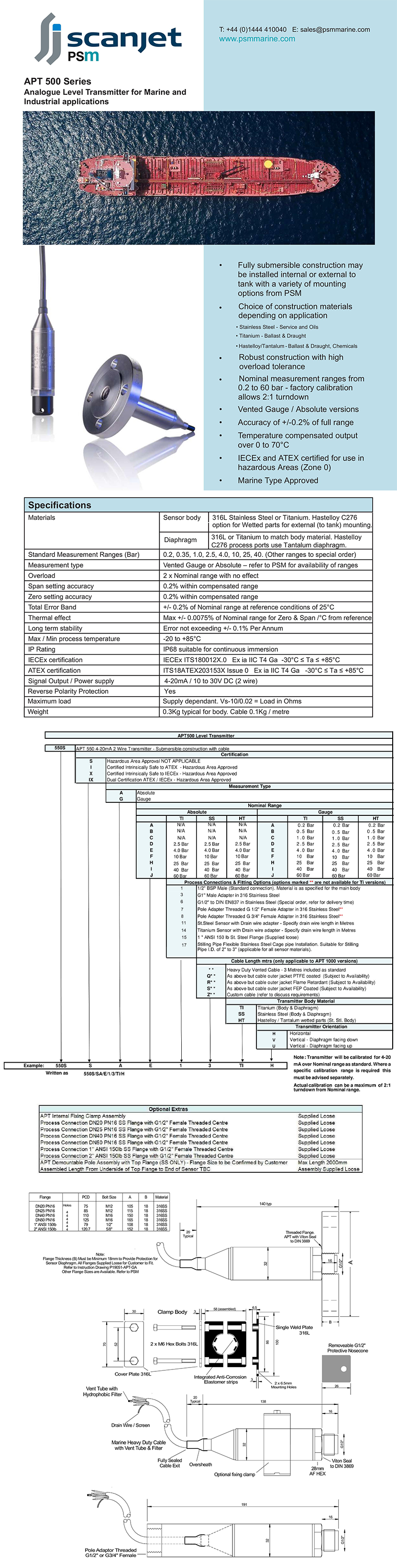 Fully submersible construction may be installed internal or external to tank with a variety of mounting options from PSM; Robust construction with high overload tolerance ; Certification for hazardous Areas (Zone 0) |