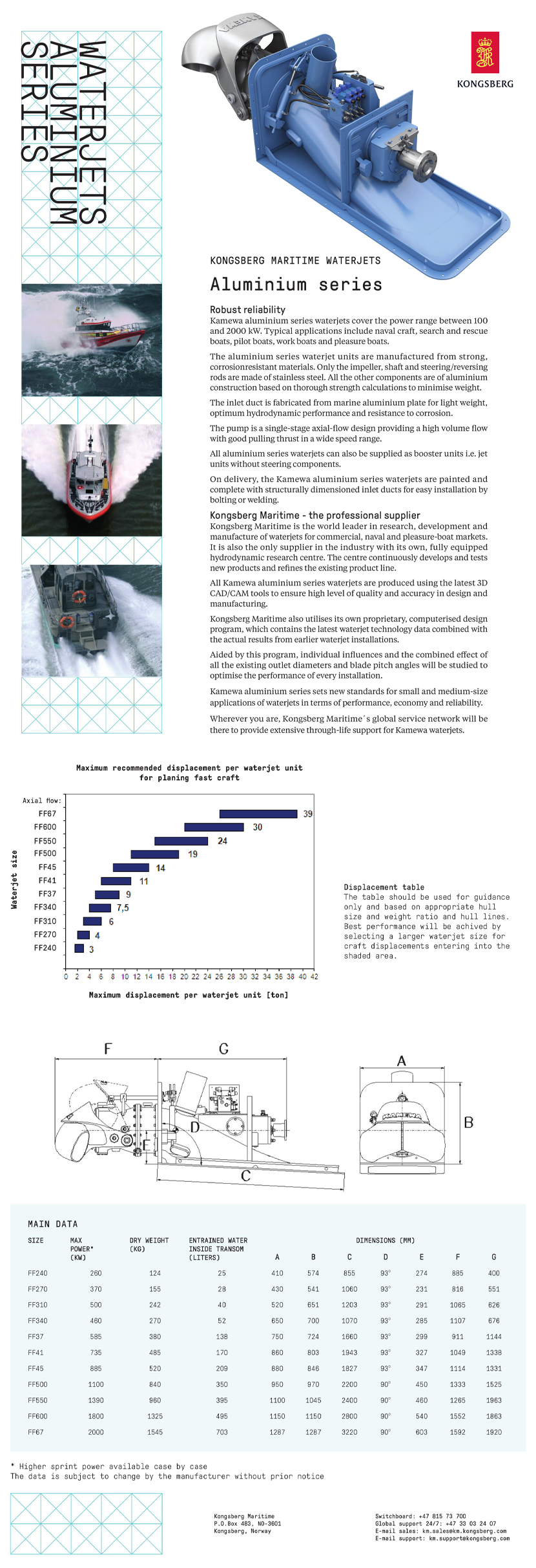 | 推薦船艇最大排水量: | 24t(單泵) | 性能亮點(diǎn): | Light weight ; Corrosion resistance ; Can provide a high volume flow with good pulling thrust in a wide speed range ; Can be supplied as booster units i.e. jet units without steering components |