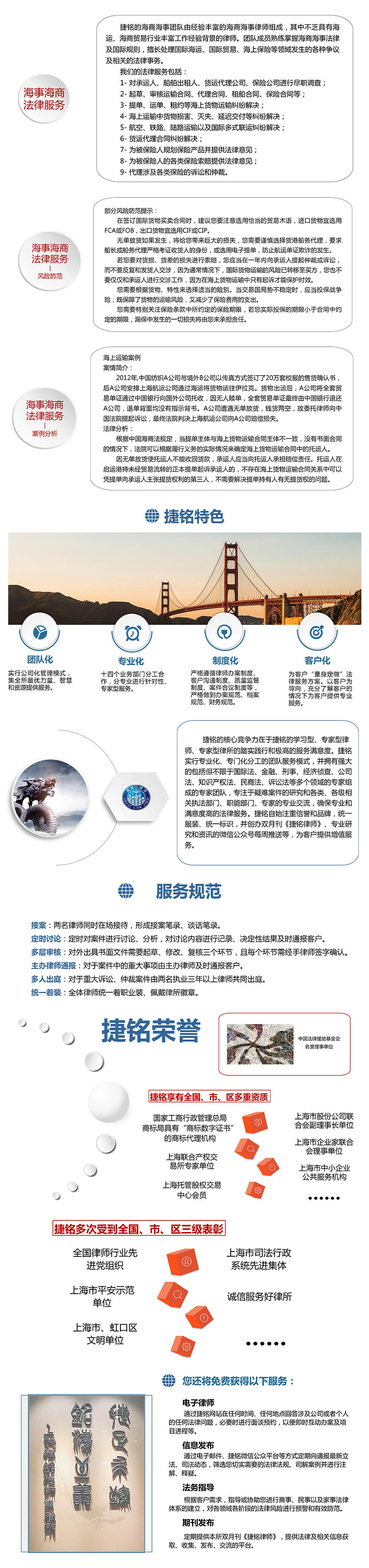 服務優勢: 由受理經驗豐富的海商海事律師組成專項團隊;團隊律師同時具備海運、海商貿易行業豐富的工作經驗 專業資質: 國家工商行政管理總局商標局具有“商標數字證書”的商標代理機構;上海聯合產權交易所專家單位;上海托管股權交易中心會員;上海市股份公司聯合會副理事長單位;上海市企業家聯合會理事單位;上海市中小企業公共服務機構等