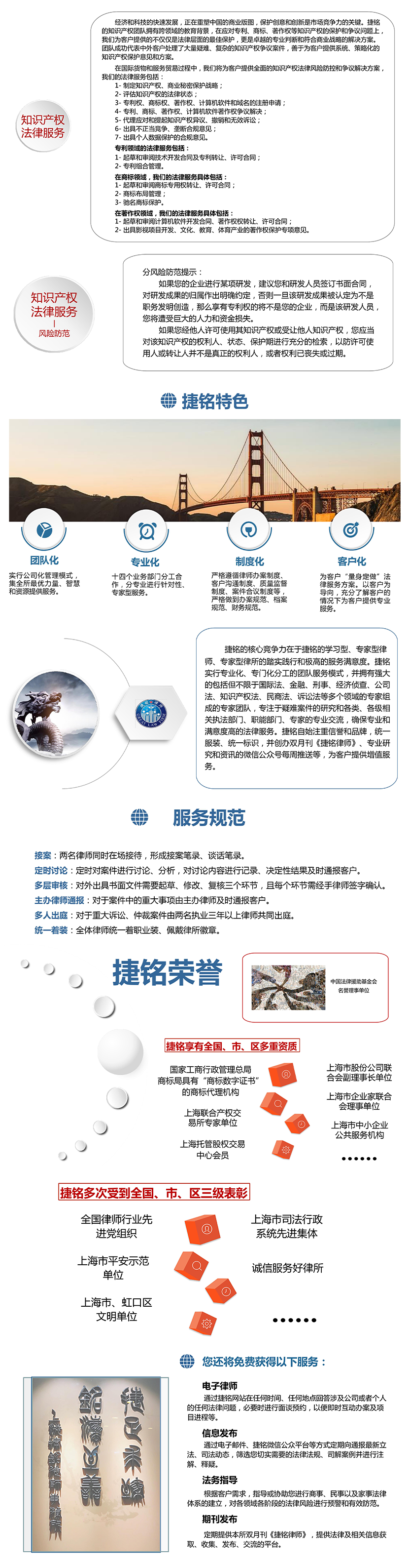 | 服務優勢: | 知識產權團隊擁有跨領域教育背景;除知識產權領域的法律保護外,可提供卓越的專業判斷與符合商業戰略的解決方案;具備大量境內外疑難、復雜的知識產權爭議案件成功解決案例 | 專業資質: | 國家工商行政管理總局商標局具有“商標數字證書”的商標代理機構;上海聯合產權交易所專家單位;上海托管股權交易中心會員;上海市股份公司聯合會副理事長單位;上海市企業家聯合會理事單位;上海市中小企業公共服務機構等 |