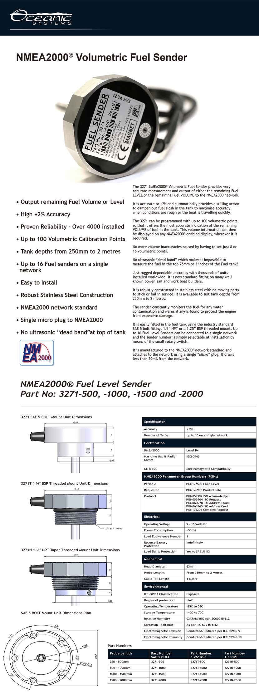 性能亮點: 船只快速航行時可保持準確度最大化;可監測燃油中混合水分情況并發出警告,保護引擎避免重大損壞;無超聲波盲區(油箱頂部空間不足75mm時依然可測);可設置輸出值為燃油液位或剩余燃油體積;可設100個容量校準點;單個NMEA2000網絡可至多同時傳輸16個本產品所測得的所有液位數據;安裝便捷 輸出信號: NA (可傳輸至NMEA2000網絡)