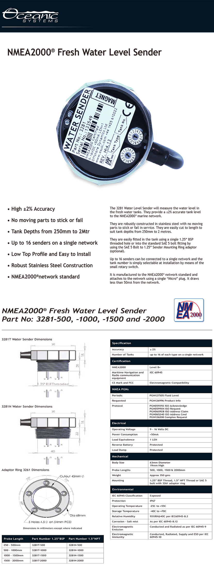 | 性能亮點: | 可適用于矮小型水箱的液位測量;單個NMEA2000網絡可至多同時傳輸16個本產品所測得的所有液位數據;安裝便捷;無活動部件,故障率低 | 輸出信號: | NA (可傳輸至NMEA2000網絡) |