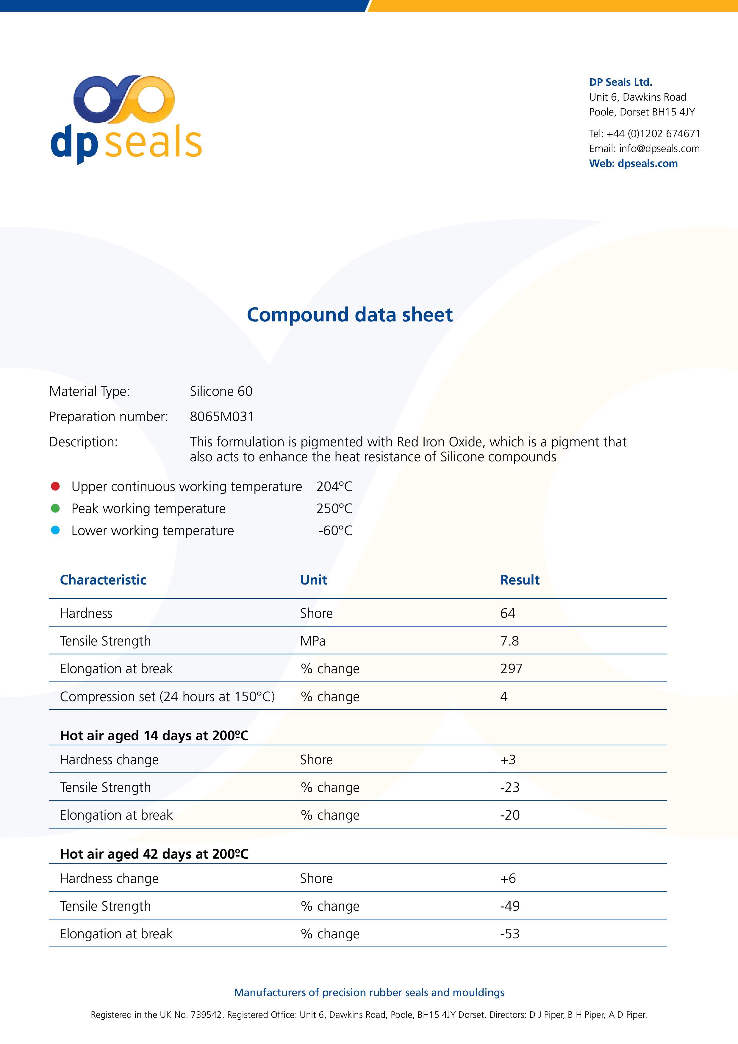 | 壓縮率: | 4%(24 hours at 150oC) | 超高溫耐受水平: | (200oC熱空氣環境下連續工作14天)硬度 +3Shore;抗張強度 -23%;斷裂伸長率 -20% ;(200oC熱空氣環境下連續工作42天)硬度 +6Shore;抗張強度 -49%;斷裂伸長率 -53% |