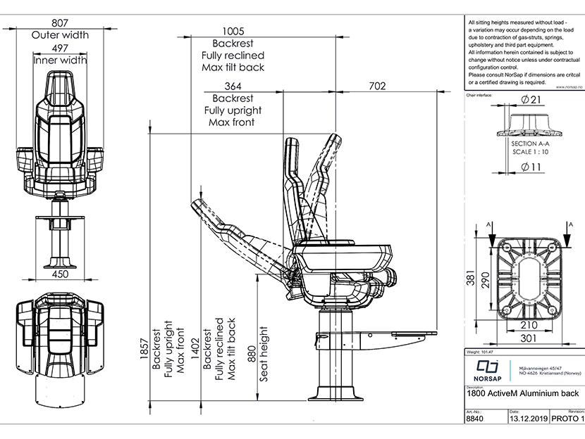 1800系列氣彈簧式重力調節鋁合金椅背座椅