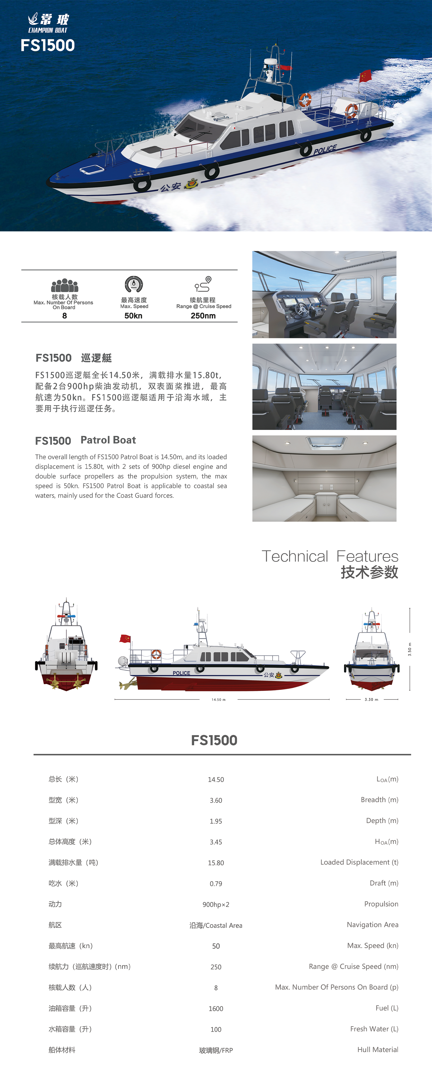 最大乘員: 8人 船體材料: 玻璃鋼/FRP
