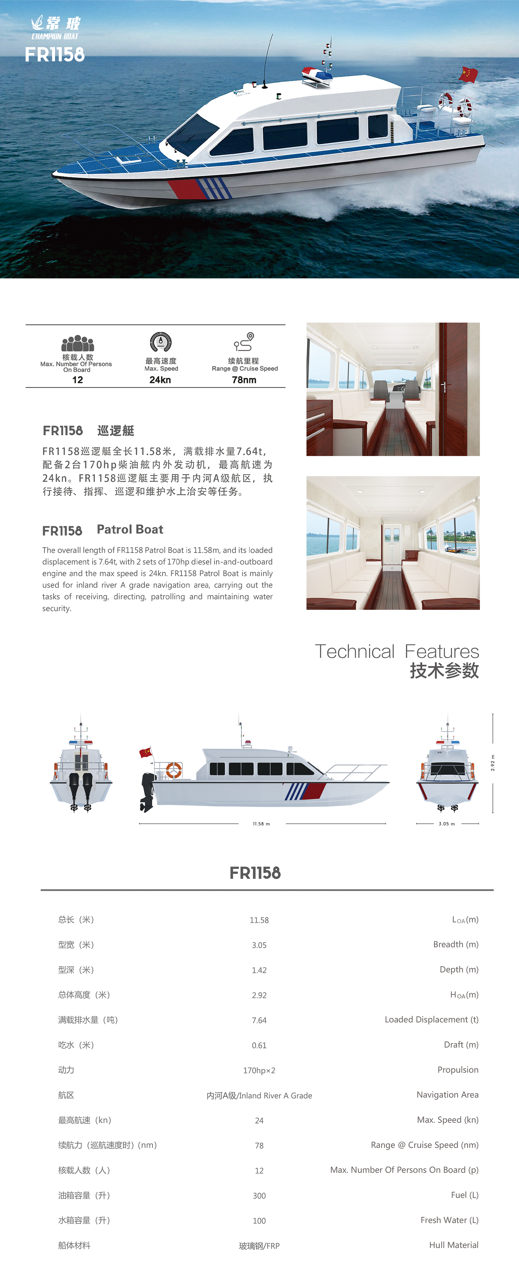 最大乘員: 12人 船體材料: 玻璃鋼/FRP