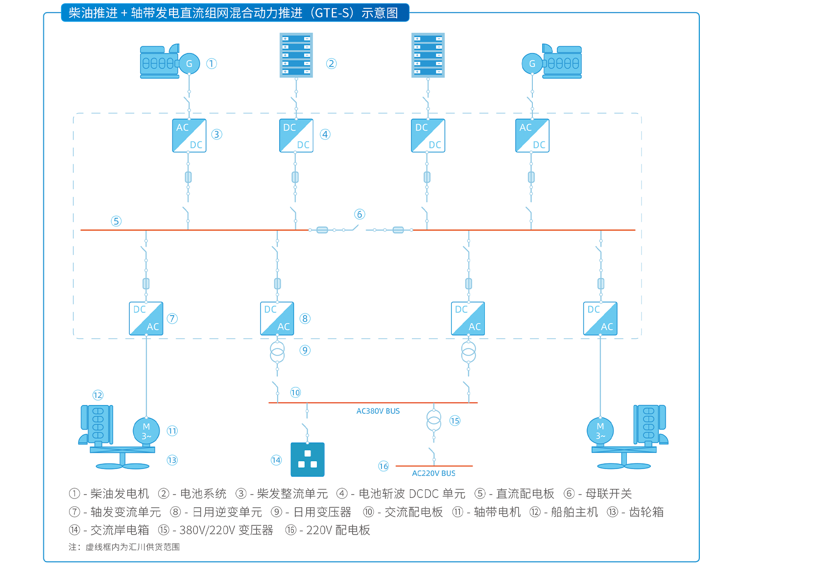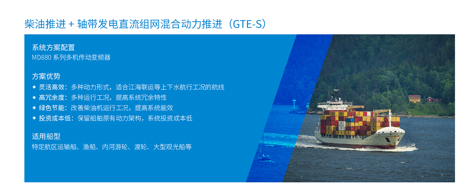 | 柴油推進(jìn) + 軸帶發(fā)電直流組網(wǎng)混合動(dòng)力推進(jìn)(GTE-S) | |||