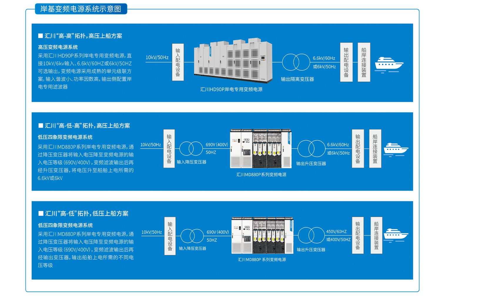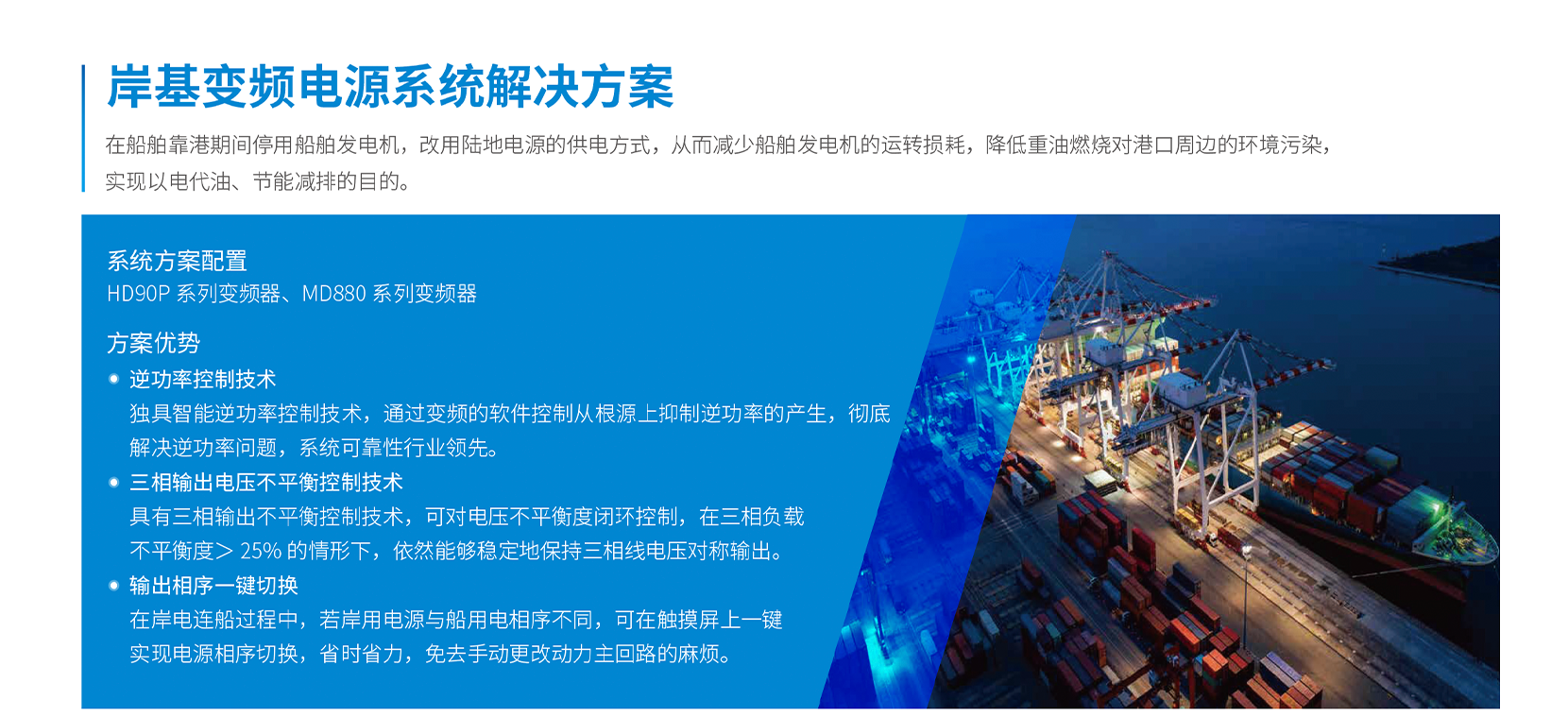 獨具智能逆功率控制技術,從根源上抑制逆功率的產生,徹底解決逆功率問題; 具有三相輸出不平衡控制技術,可對電壓不平衡度閉環控制;在岸電連船過程中,若岸用電源與船用電相序不同,可在觸摸屏上一鍵實現電源相序切換,省時省力