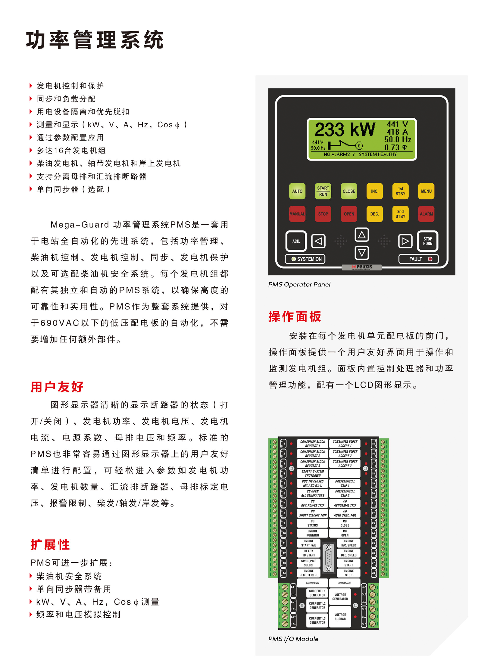 用于電站全自動化; 每個發電機組都 配有其獨立和自動的PMS系統;對于690VAC以下的低壓配電板的自動化管理,不需要增加任何額外部件;圖形界面直觀、易配置;PMS可進一步擴展更多功能