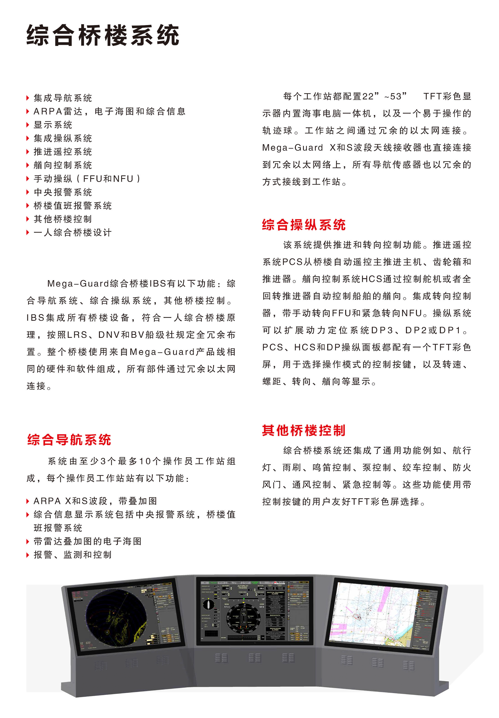 界面操作方式: 按鍵 性能亮點: 同時具備“綜合導航系統、綜合操縱系統,其他橋樓控制”等多種功能;整個橋樓使用來自與Mega- Guard產品線相同的硬件和軟件組成,所有部件通過冗余以太網連接