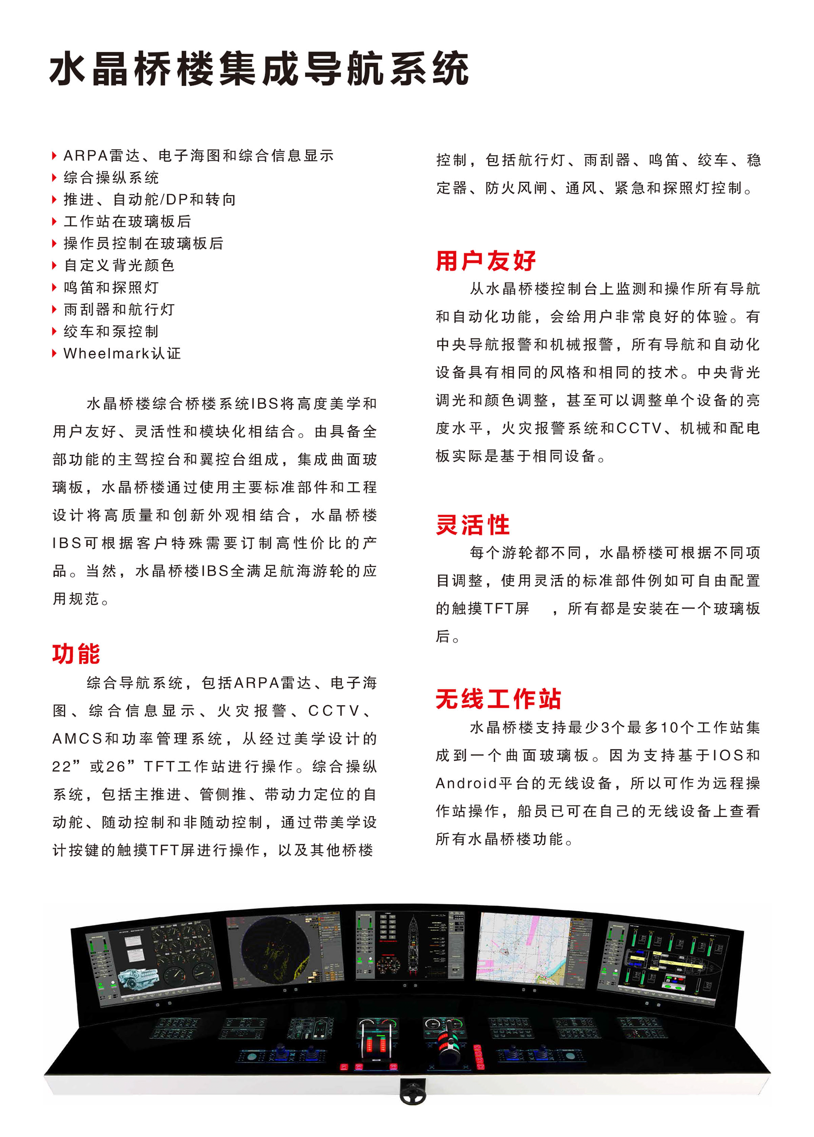 外形美觀;根據不同項目調整方案;模塊化系統;支持遠程無線設備;可從水晶橋樓控制臺上監測和操作所有導航和自動化功能